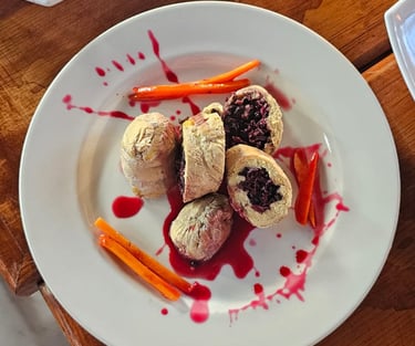 200 gr. rollo de carne de res, relleno de zanahoria y calabaza, acompañado de papa cambray y frijoles refritos.