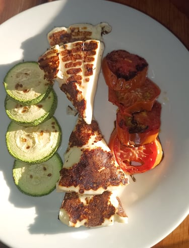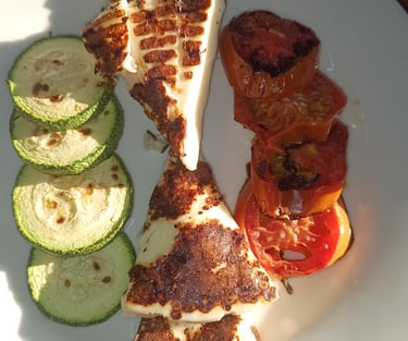 300 gr. Queso panela a la plancha acompañado de jitomate bola y calabazas asadas con aceite de oliva.